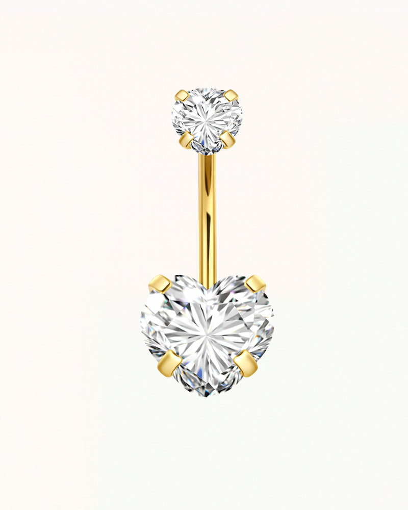 Dieses elegante Bauchnabelpiercing besticht durch einen markanten, herzförmigen Zirkonia und verleiht dem Piercing einen romantischen und raffinierten Look. Die Kombination des größeren, herzförmigen Steins mit dem darüber liegenden, dezenten Zirkonia sorgt für eine harmonische Balance und zeitlose Eleganz.