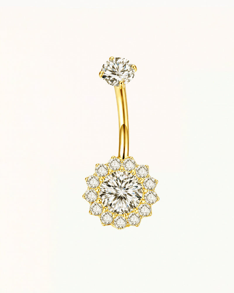 Dieses elegante Bauchnabelpiercing besticht durch einen großen, runden Mittelstein, der von einem Kranz kleiner, funkelnder Edelsteine umgeben ist. Das florale Design verleiht ihm einen luxuriösen und edlen Look, der sofort ins Auge fällt. Ein dezenter, runder Stein rundet das Gesamtbild perfekt ab.